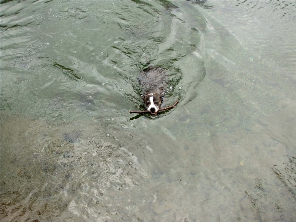 | Harvey takes a swim in the cold crystal clear water of the River Derwent to retrieve a stick. | ||||||||||