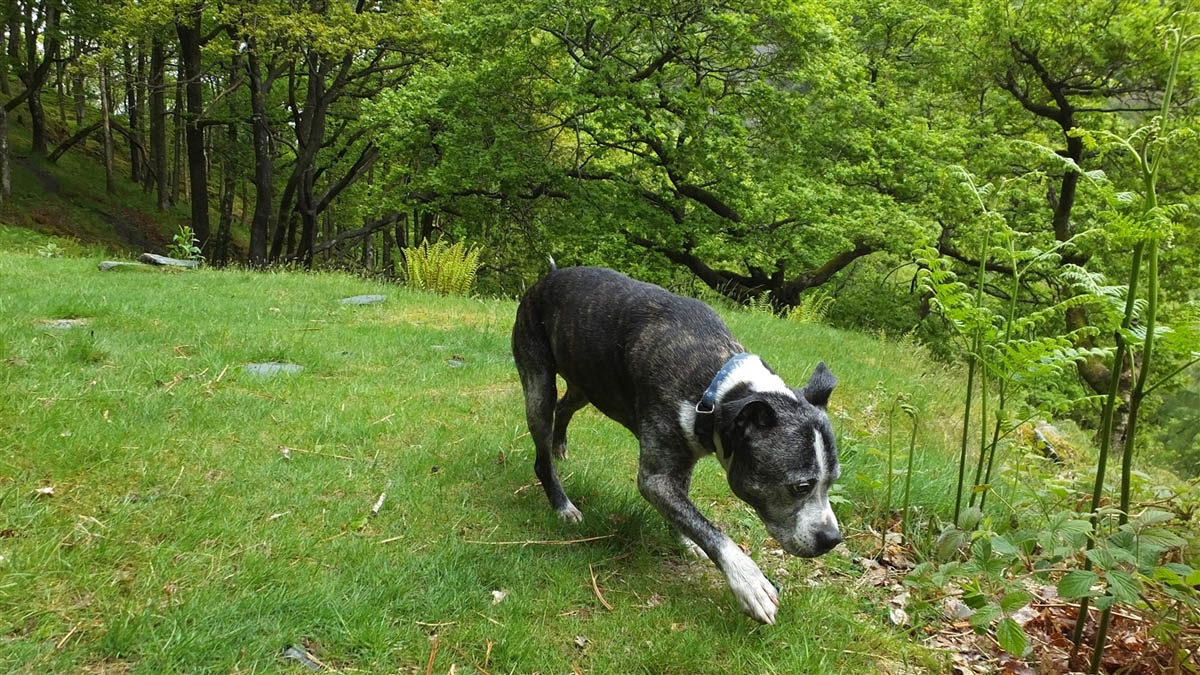 | Harvey and I on the steep path through the slate near the top of Castle Crag | |||||