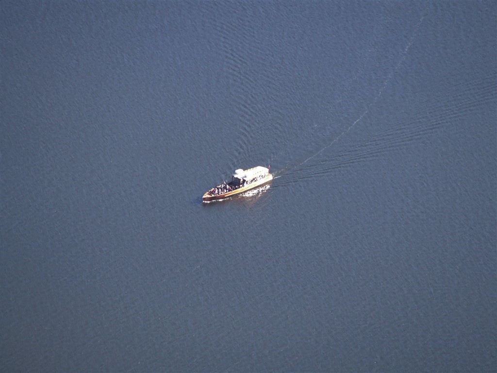 | Zooming in on a ferry from Catbells summit. This was meant to be our transport home - but too much water in the lake meant that the landing stages were under water and so there was to be no ride home for us this time. | |||||