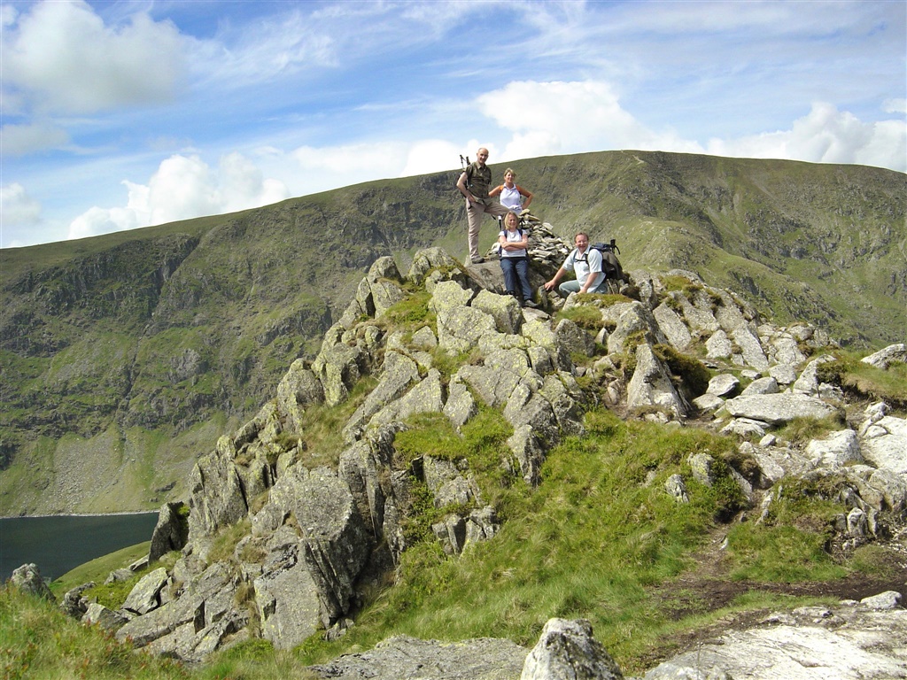 | All of us on Rough Crag summit. Blea Water to the left. |