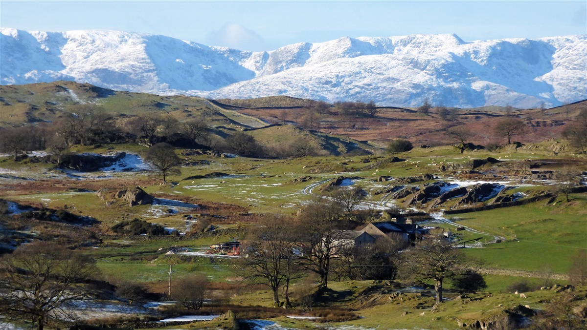 | Beautiful coutryside around Frost Hole and Birk Field Farm and the Lakeland mountains snow covered | |||||||||||||||||||||||||||