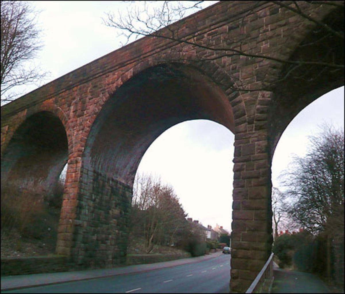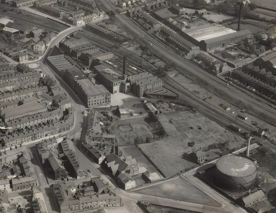 The chimney has been demolished but the mill is still there. The viaduct was blown up in 1968 to make way for the M61