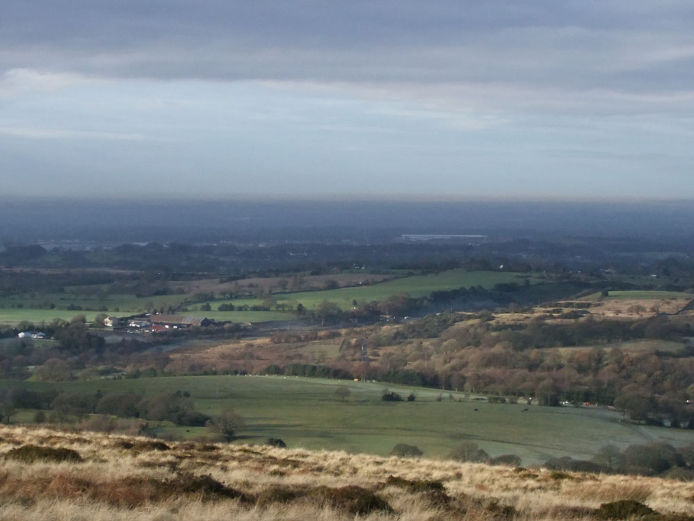 The slope of Heapey Moor leads down to the flatness of the Lancashire plain